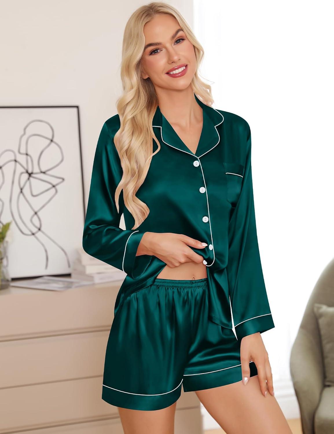 SWOMOG Womens 2 PCS / 3 PCS Pajamas Set Silk Satin Long Sleeve Sleepwear Button Down Loungewear Pjs Nightwear(Z – Deep Green – 2 Pcs)