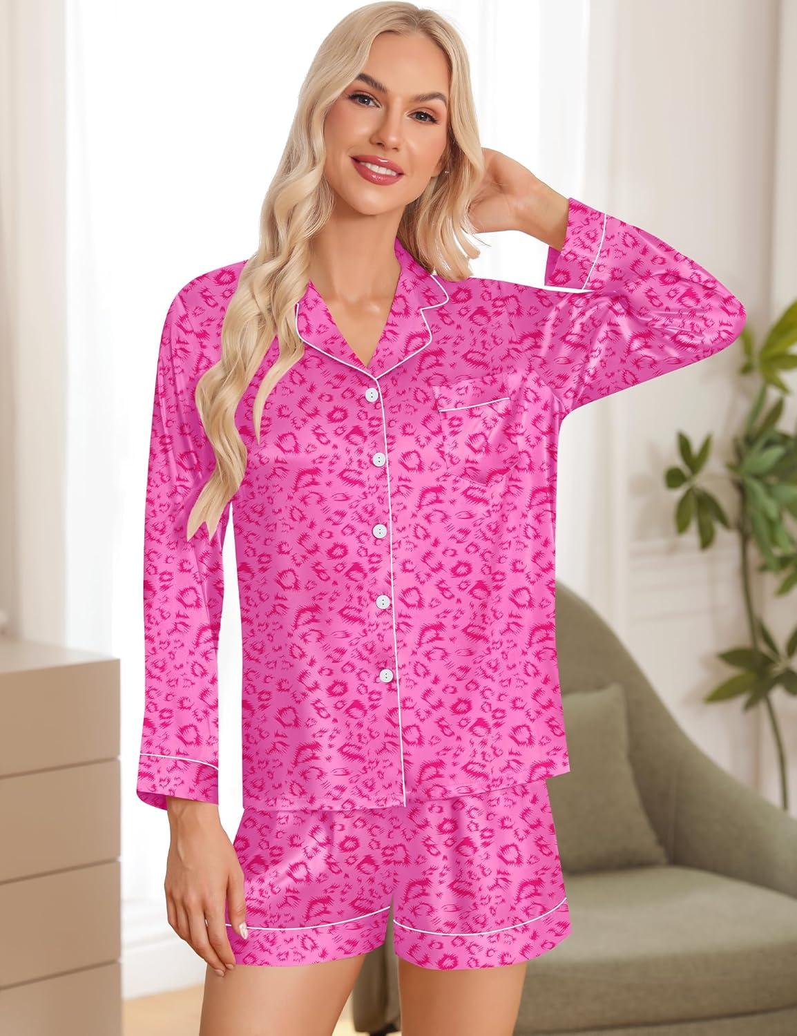 SWOMOG Womens 2 PCS / 3 PCS Pajamas Set Silk Satin Long Sleeve Sleepwear Button Down Loungewear Pjs Nightwear(Z – Hot Pink Leopard – 2 Pcs)