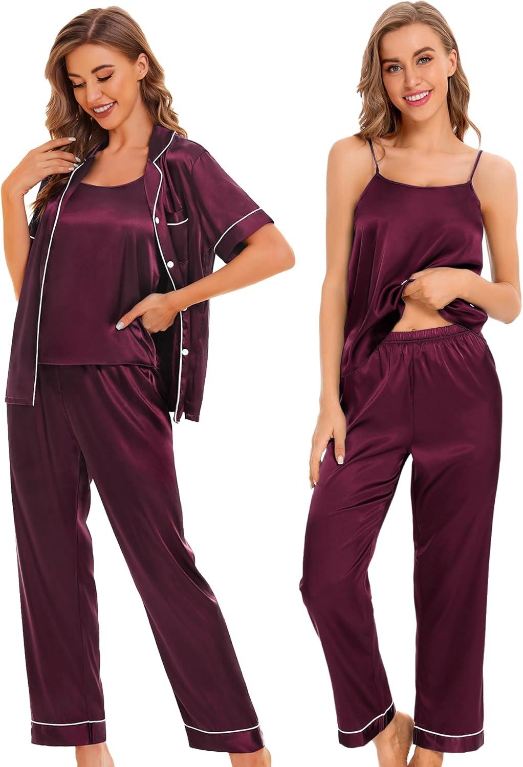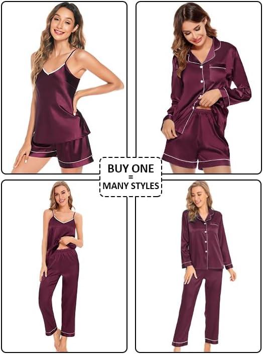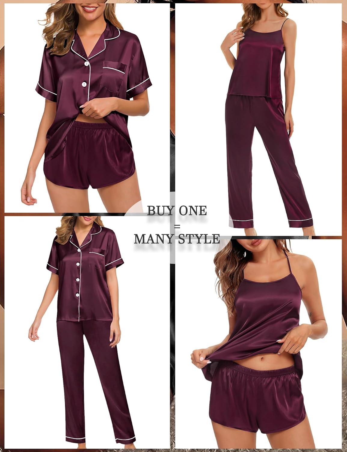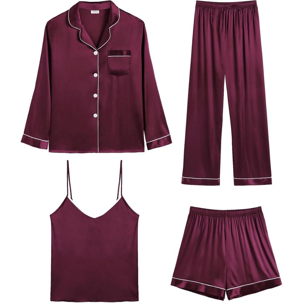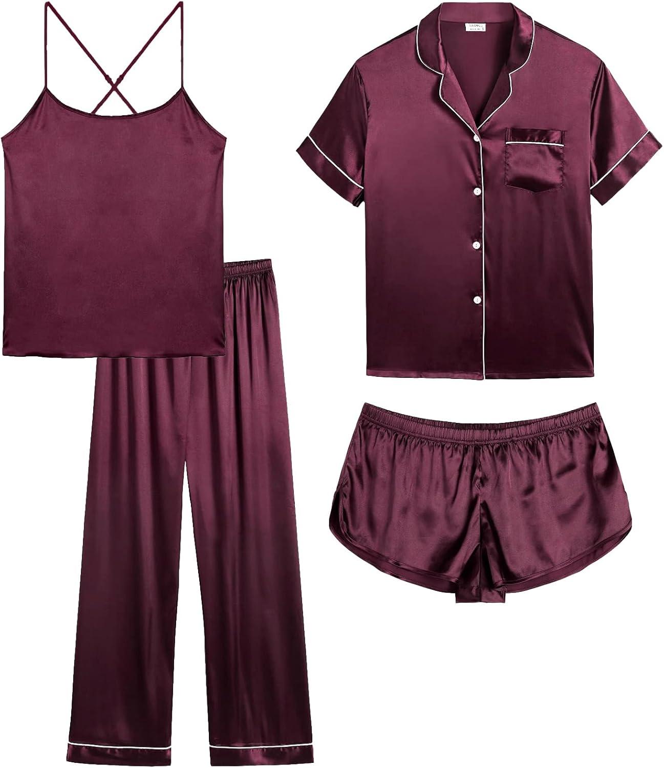 SWOMOG 4 Piece Silky Pajamas for Women Short Sleeve Button Down Sleepwear Cami Top and Shorts Pj Sets Sleep Shirts Lounge Pants Nightwear