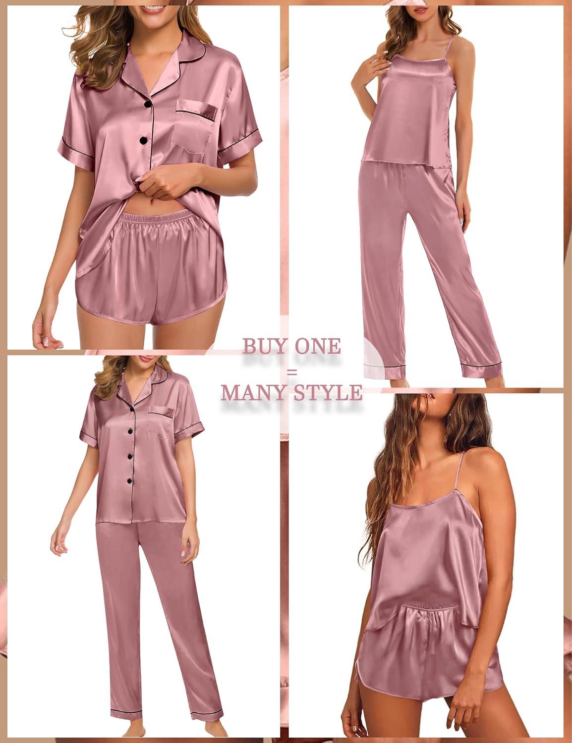 imageSWOMOG Womens 4pcs Pajamas Sets Silk Satin Pjs Sexy Cami Shorts Set Button Down Long Short Sleeve Sleepwear LoungewearMisty Rose
