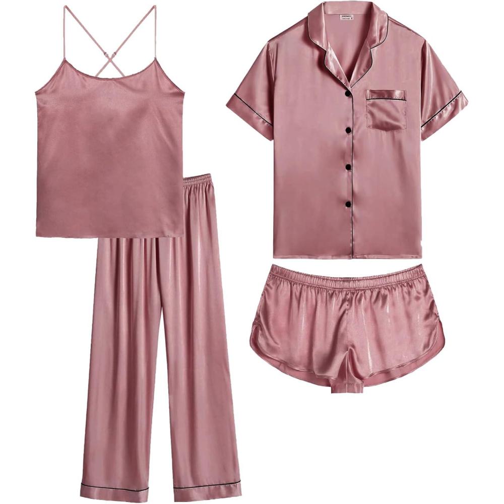 SWOMOG Womens 4pcs Pajamas Sets Silk Satin Pjs Sexy Cami Shorts Set Button Down Long Short Sleeve Sleepwear Loungewear(Misty Rose)