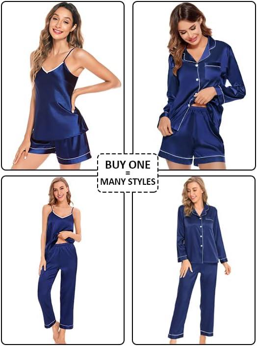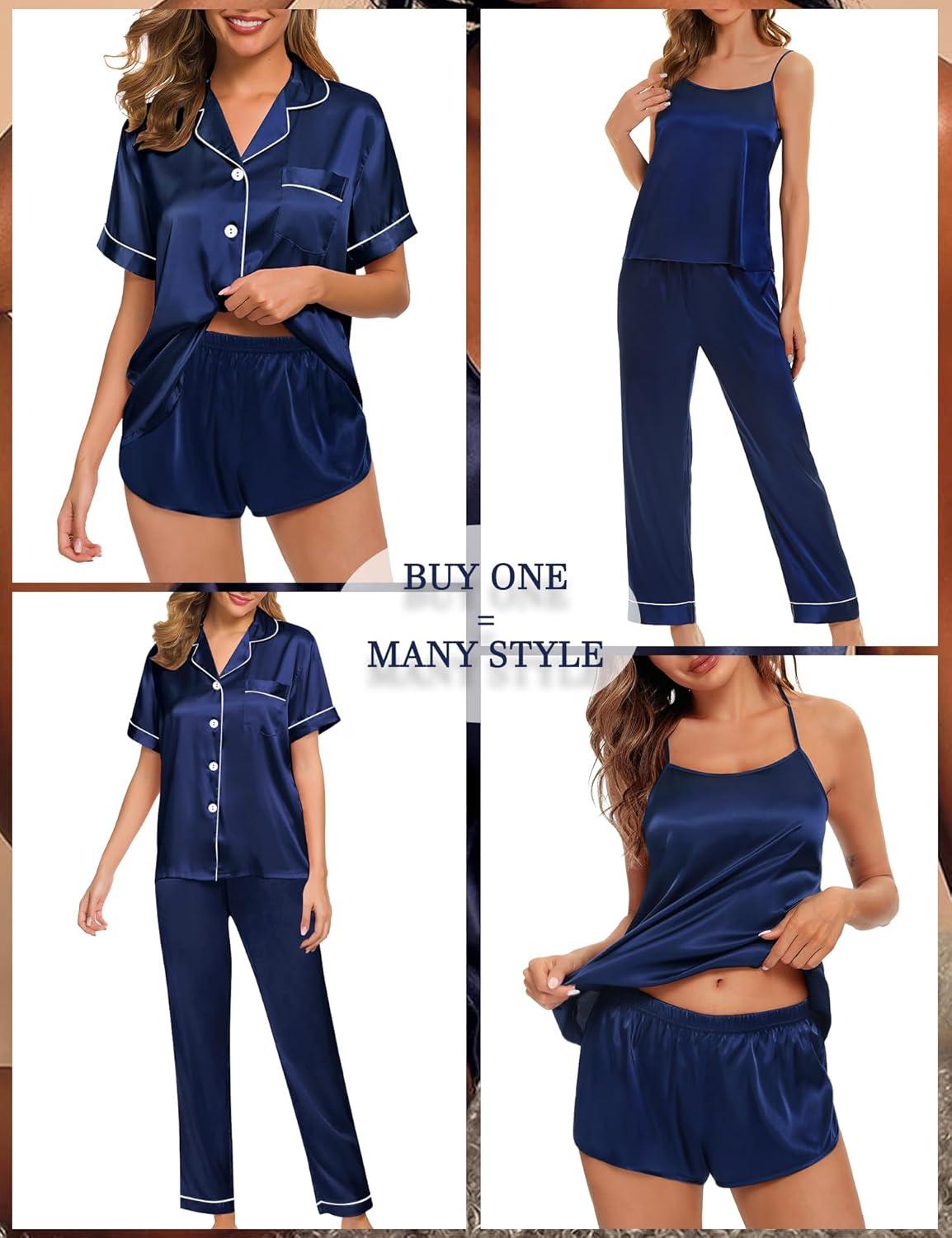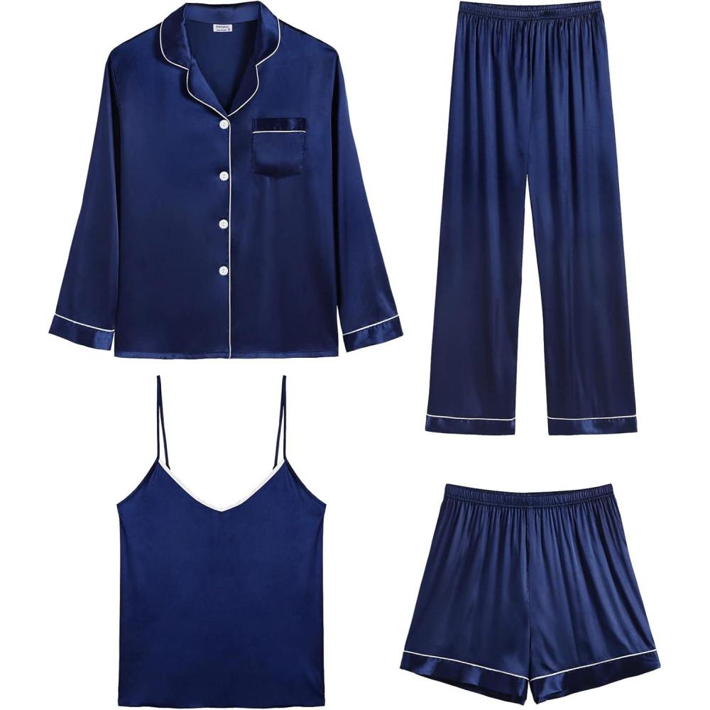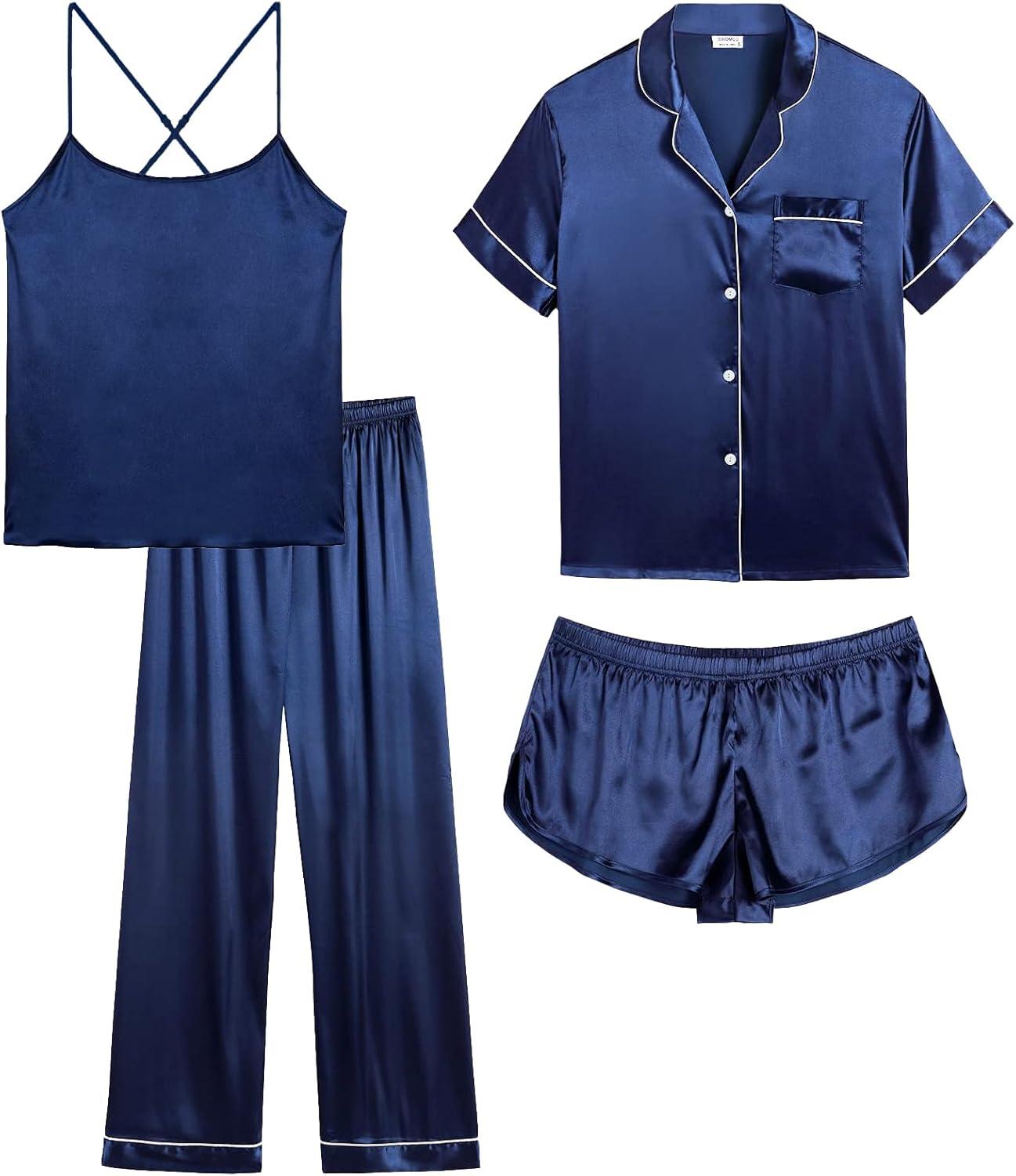 SWOMOG Womens 4pcs Pajamas Sets Silk Satin Pjs Sexy Cami Shorts Set Button Down Long Short Sleeve Sleepwear Loungewear(Navy Blue)