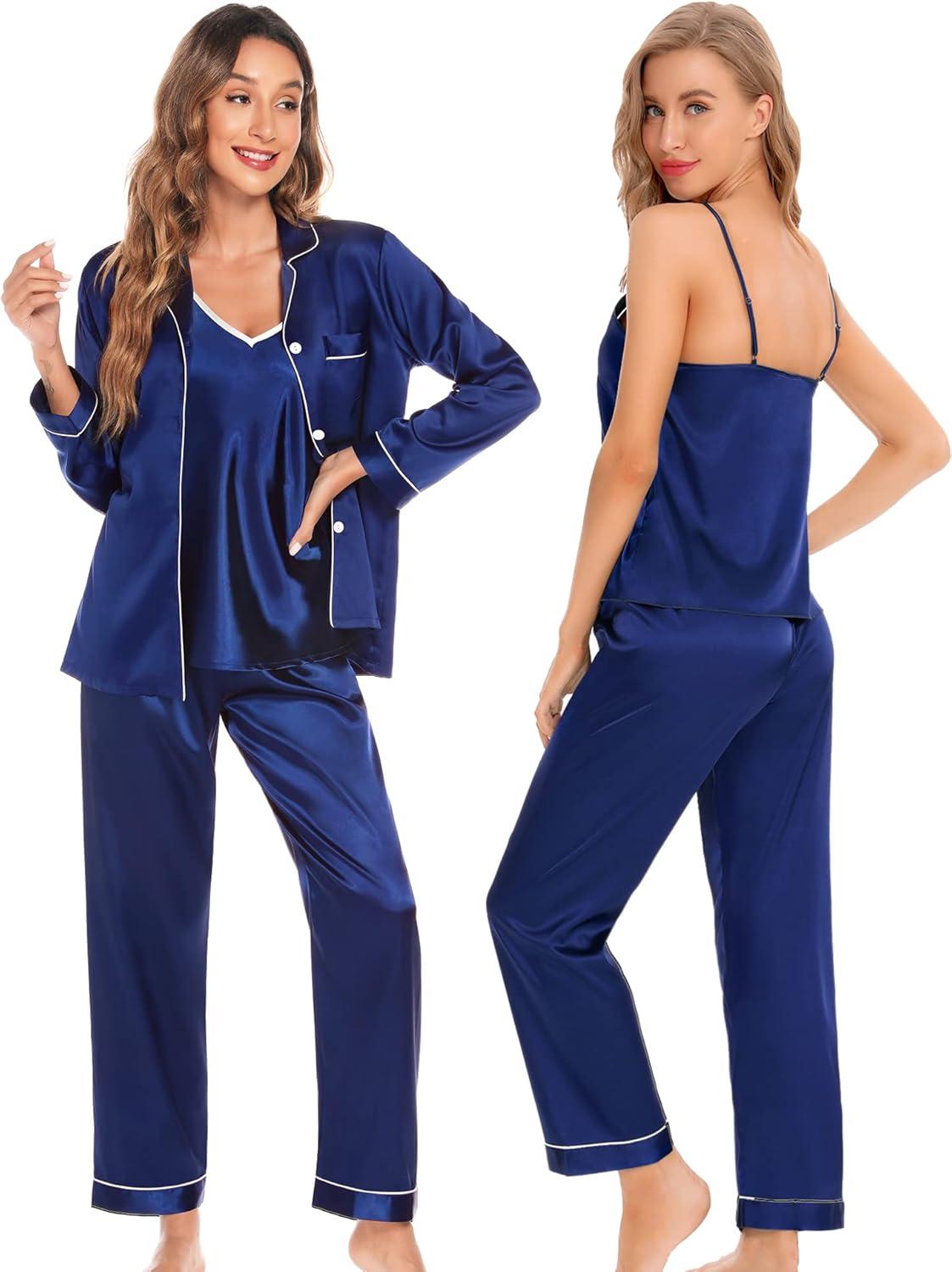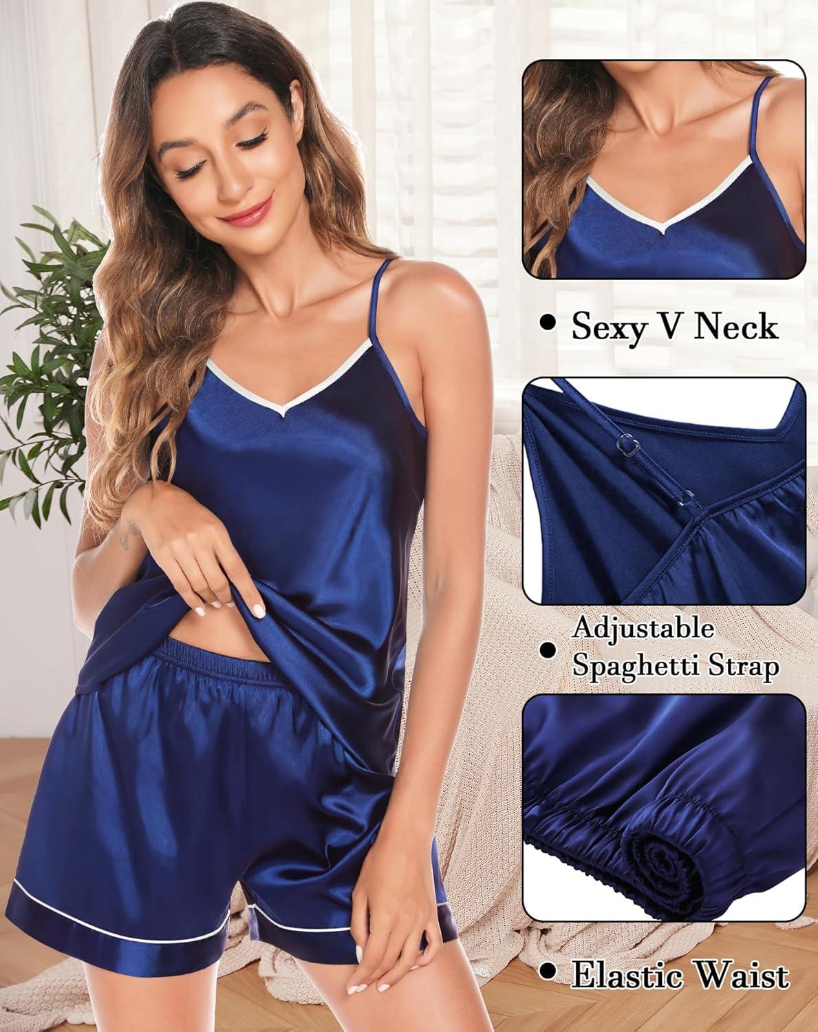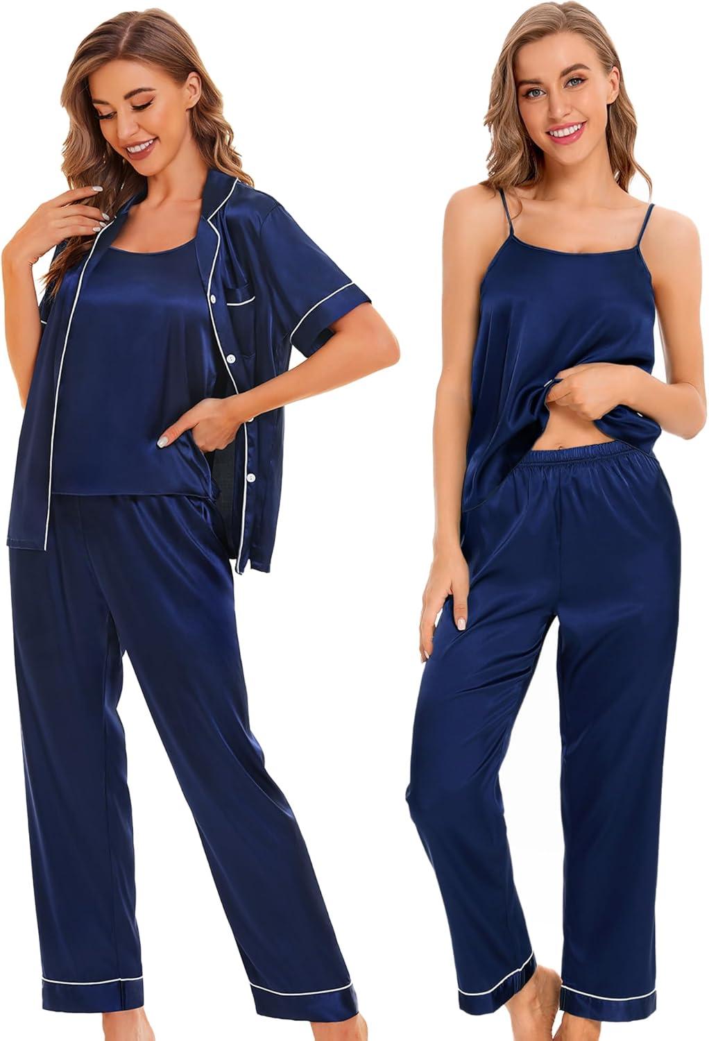 SWOMOG Womens 4pcs Pajamas Sets Silk Satin Pjs Sexy Cami Shorts Set Button Down Long Short Sleeve Sleepwear Loungewear(Navy Blue)