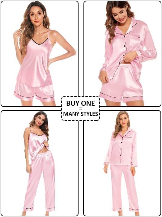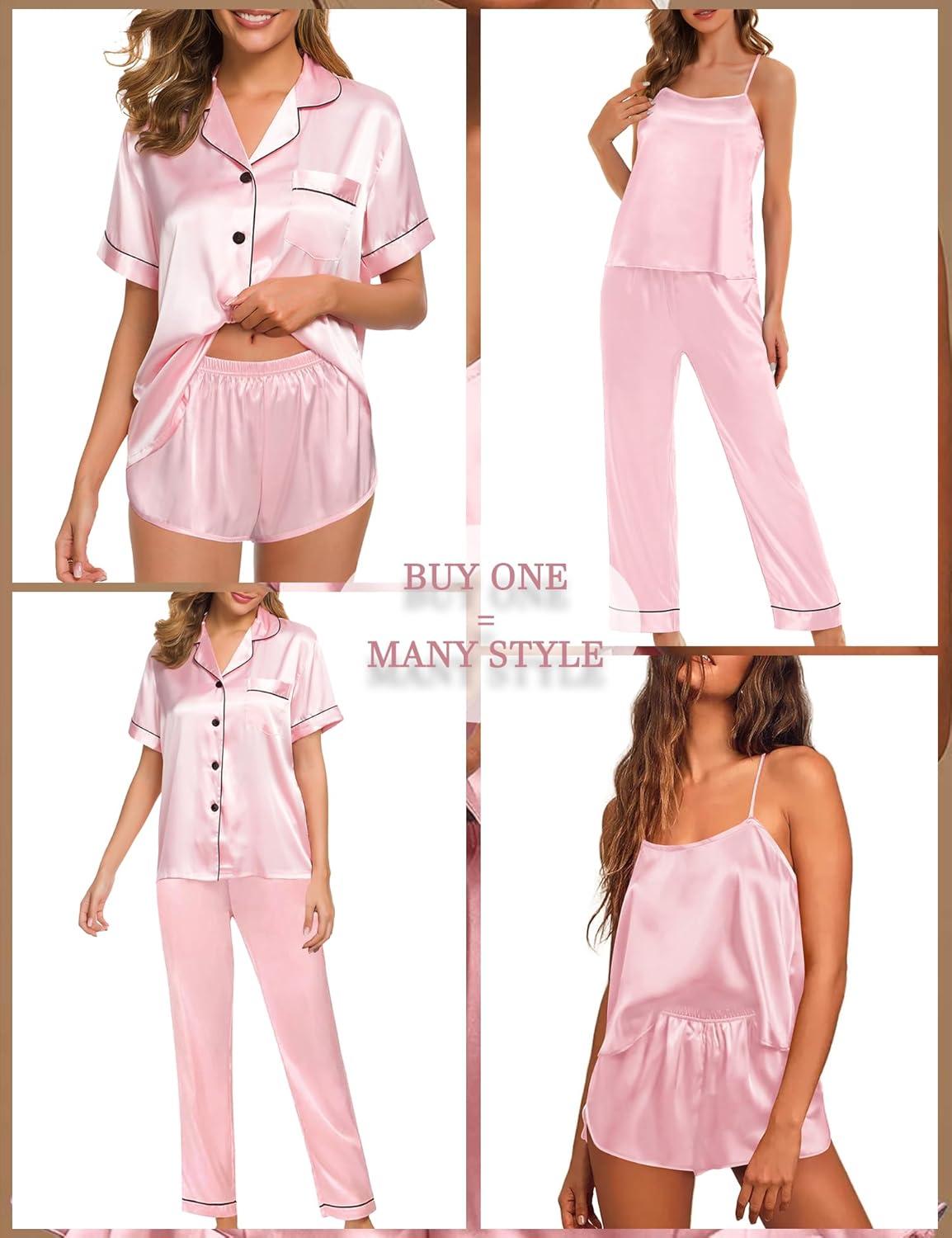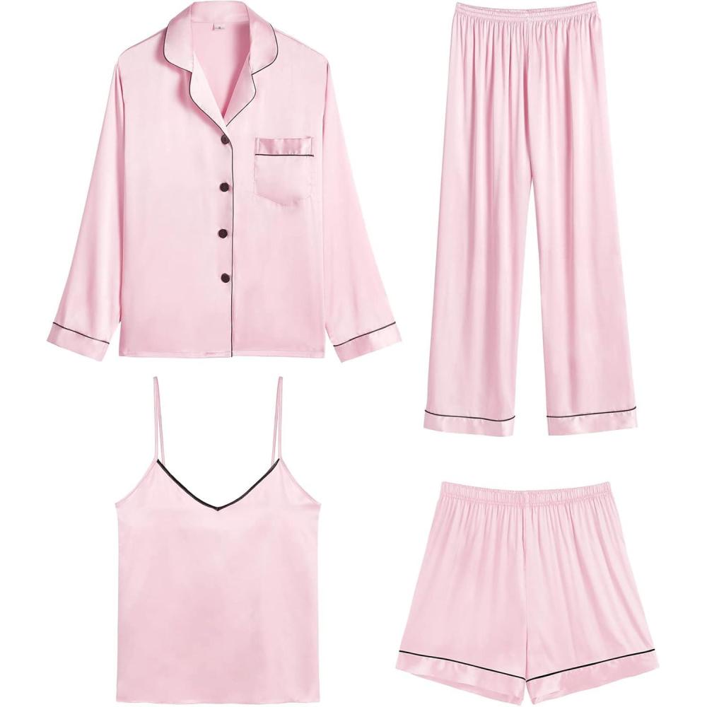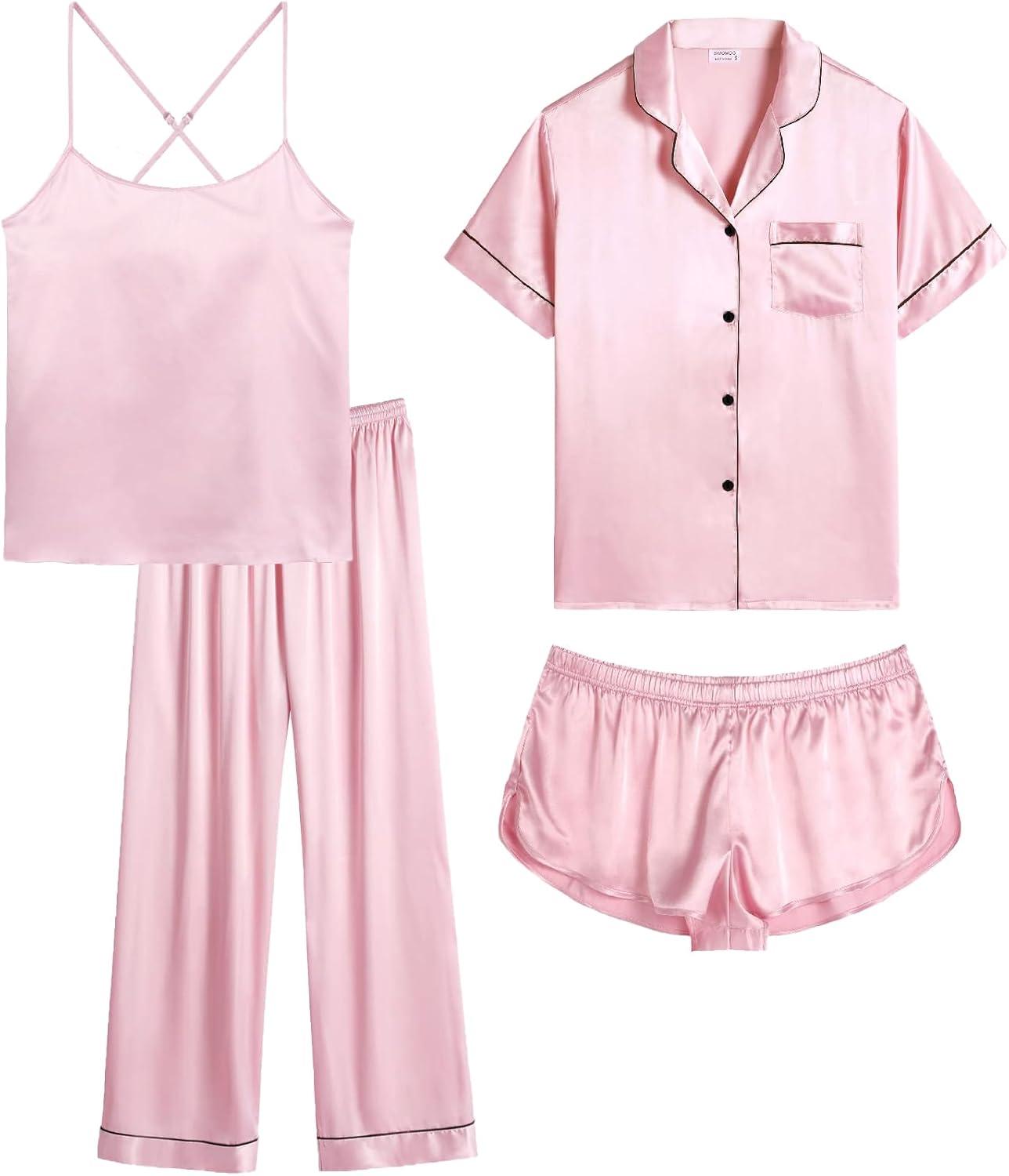 SWOMOG 4 Piece Silky Pajamas for Women Short Sleeve Button Down Sleepwear Cami Top and Shorts Pj Sets Sleep Shirts Lounge Pants Nightwear