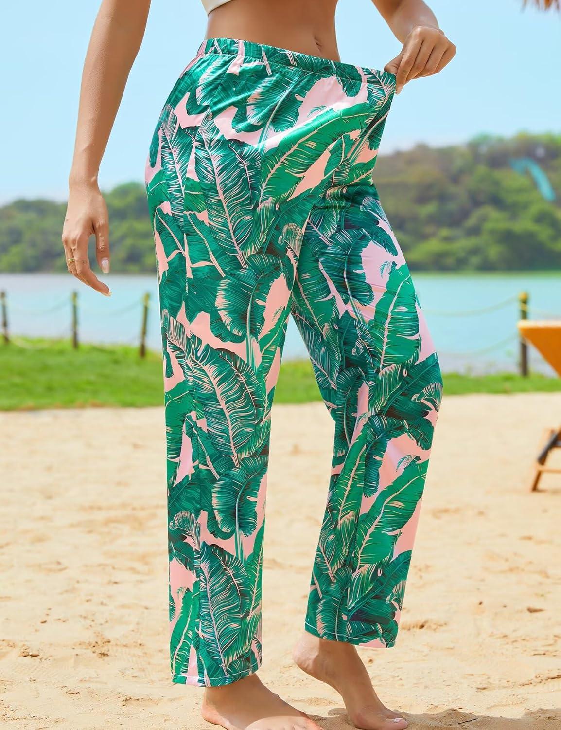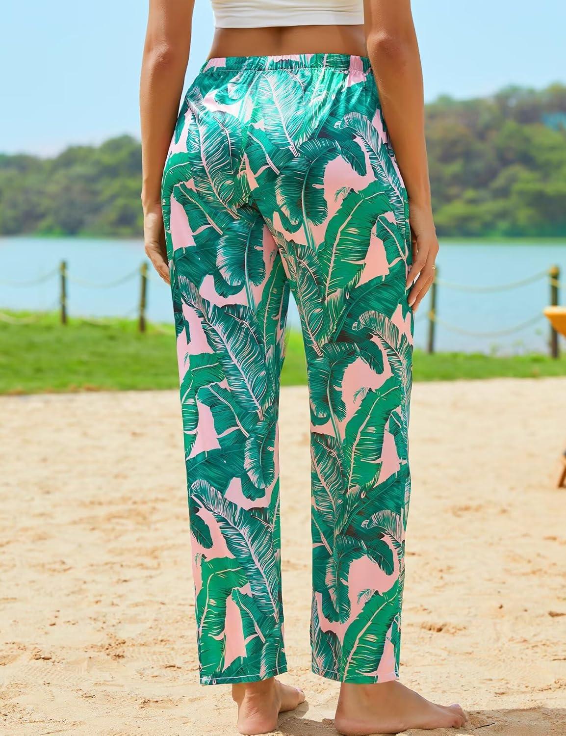 SWOMOG Women's Silk Satin Pajama Pants Longs Silky Sleep Pants Loungewear Trousers Elastic Waist Lounge Pj Bottoms(Pink Leaves)