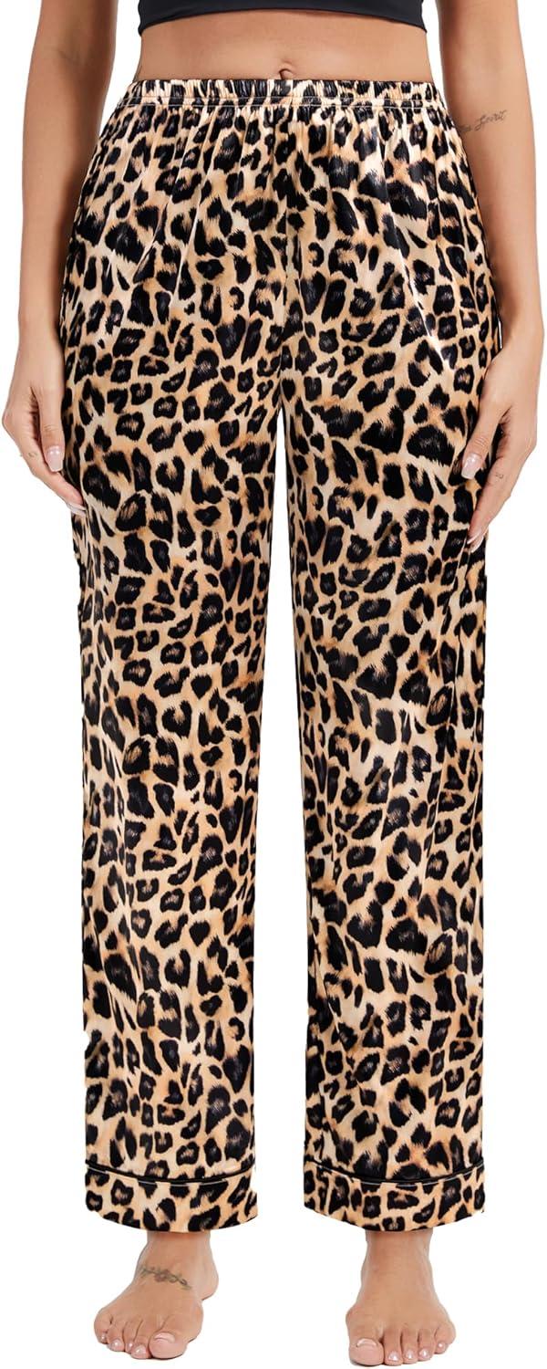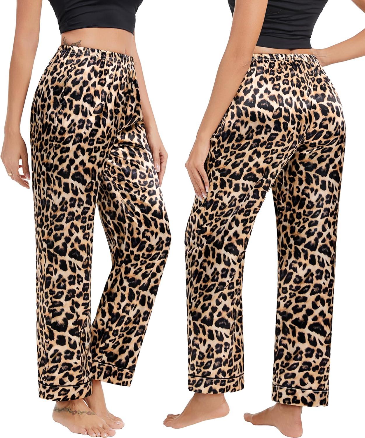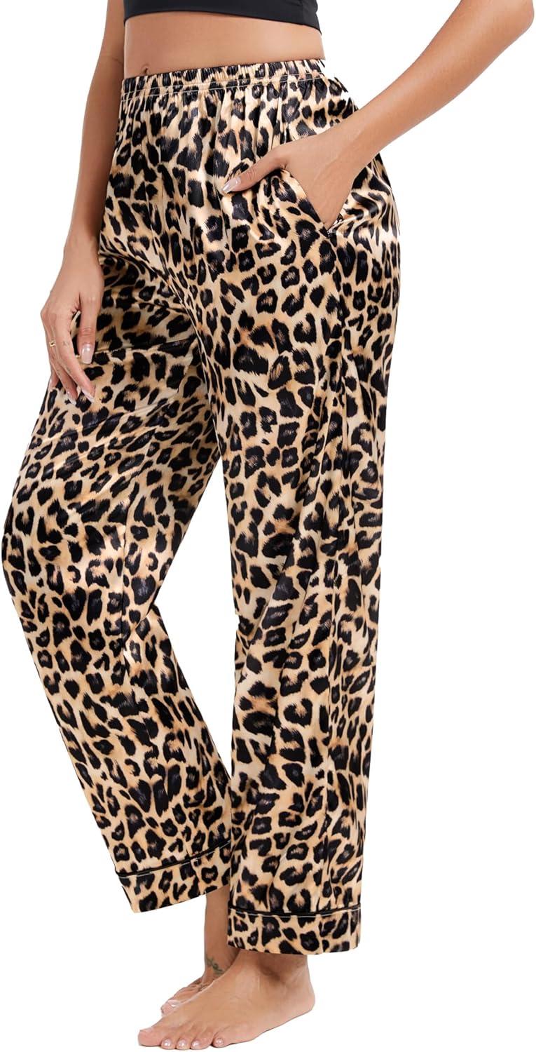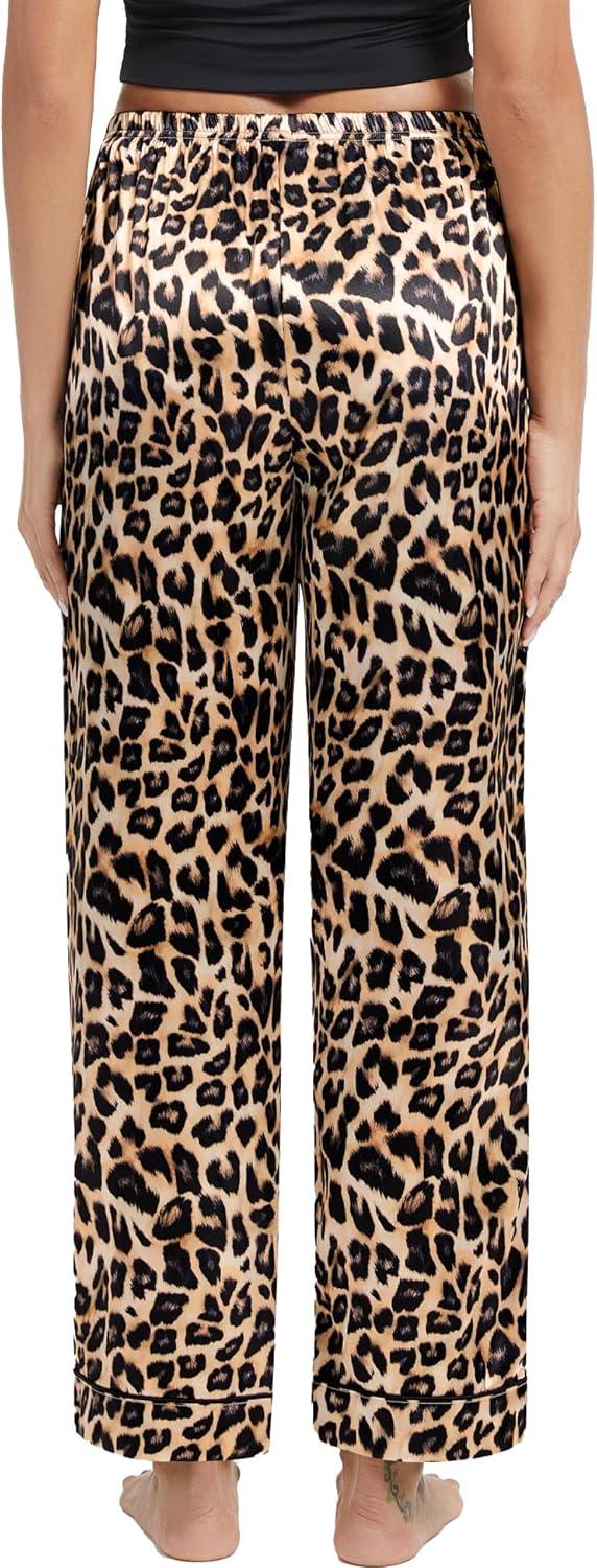 SWOMOG Women's Silk Satin Pajama Pants Longs Silky Sleep Pants Loungewear Trousers Elastic Waist Lounge Pj Bottoms(Pipping-leopard)
