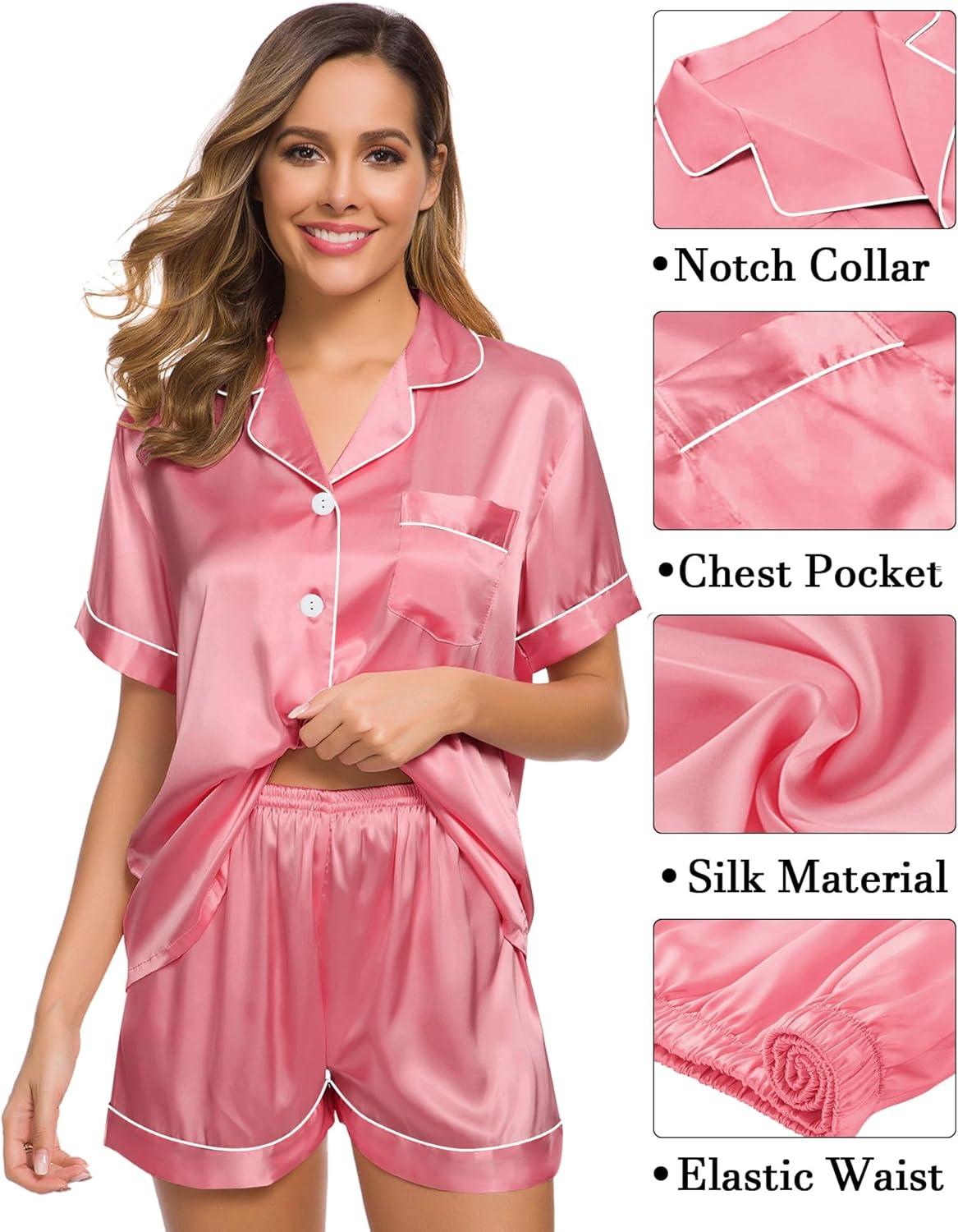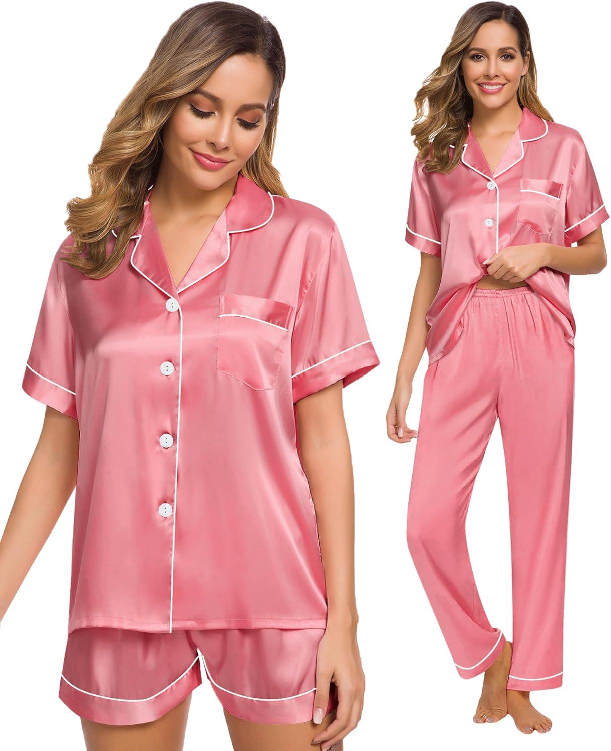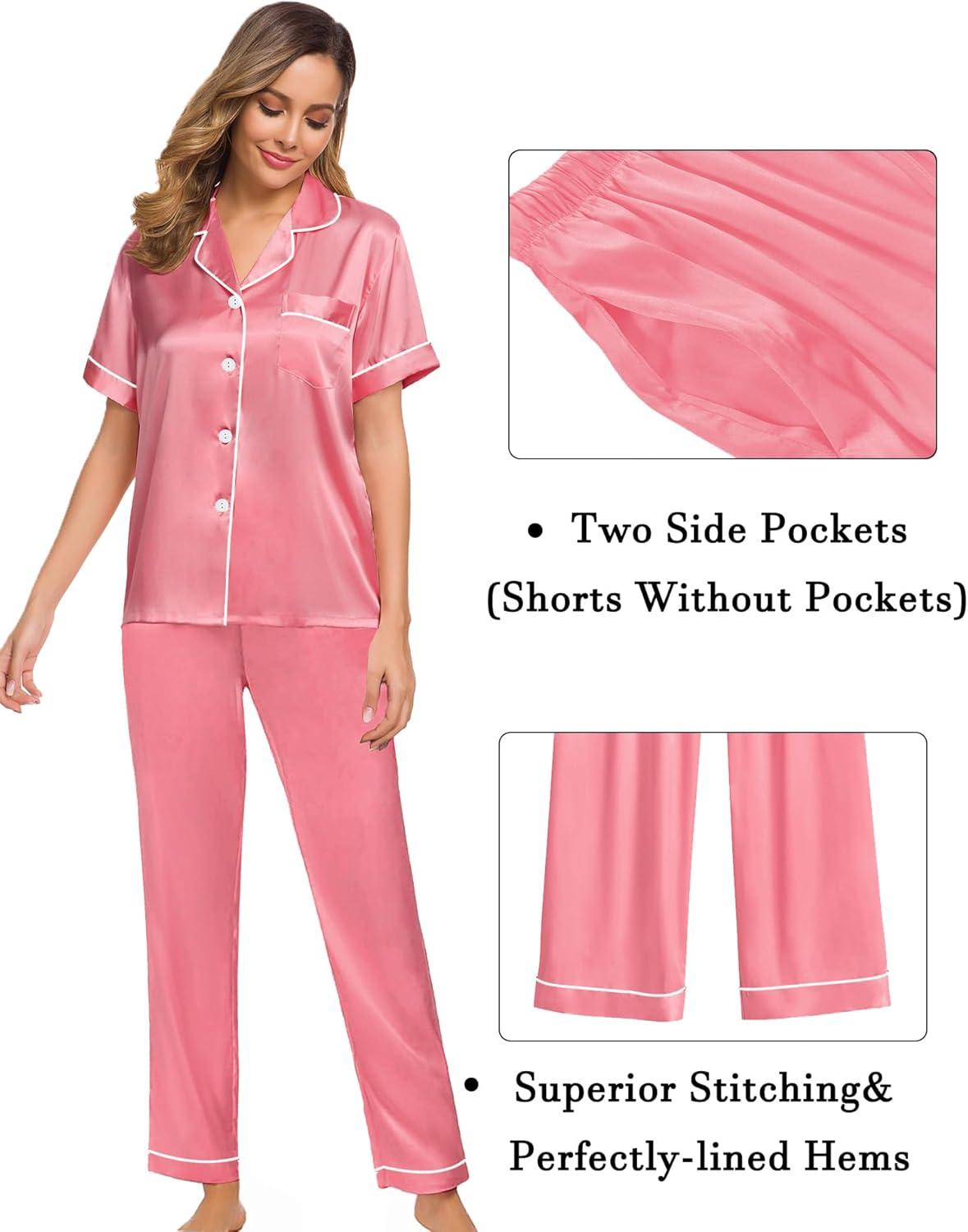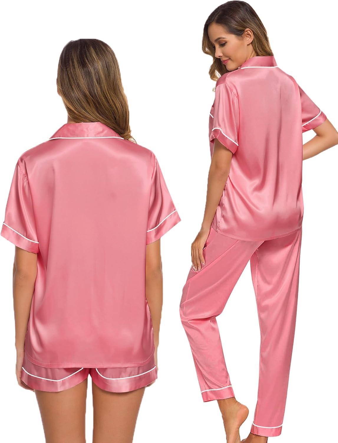 SWOMOG Womens Silk Satin Pajama Sets 3Pcs Button Down Pj Set Short Sleeve Sleepwear Loungewear Pjs Nightwear XS-XXL(Coral Red)