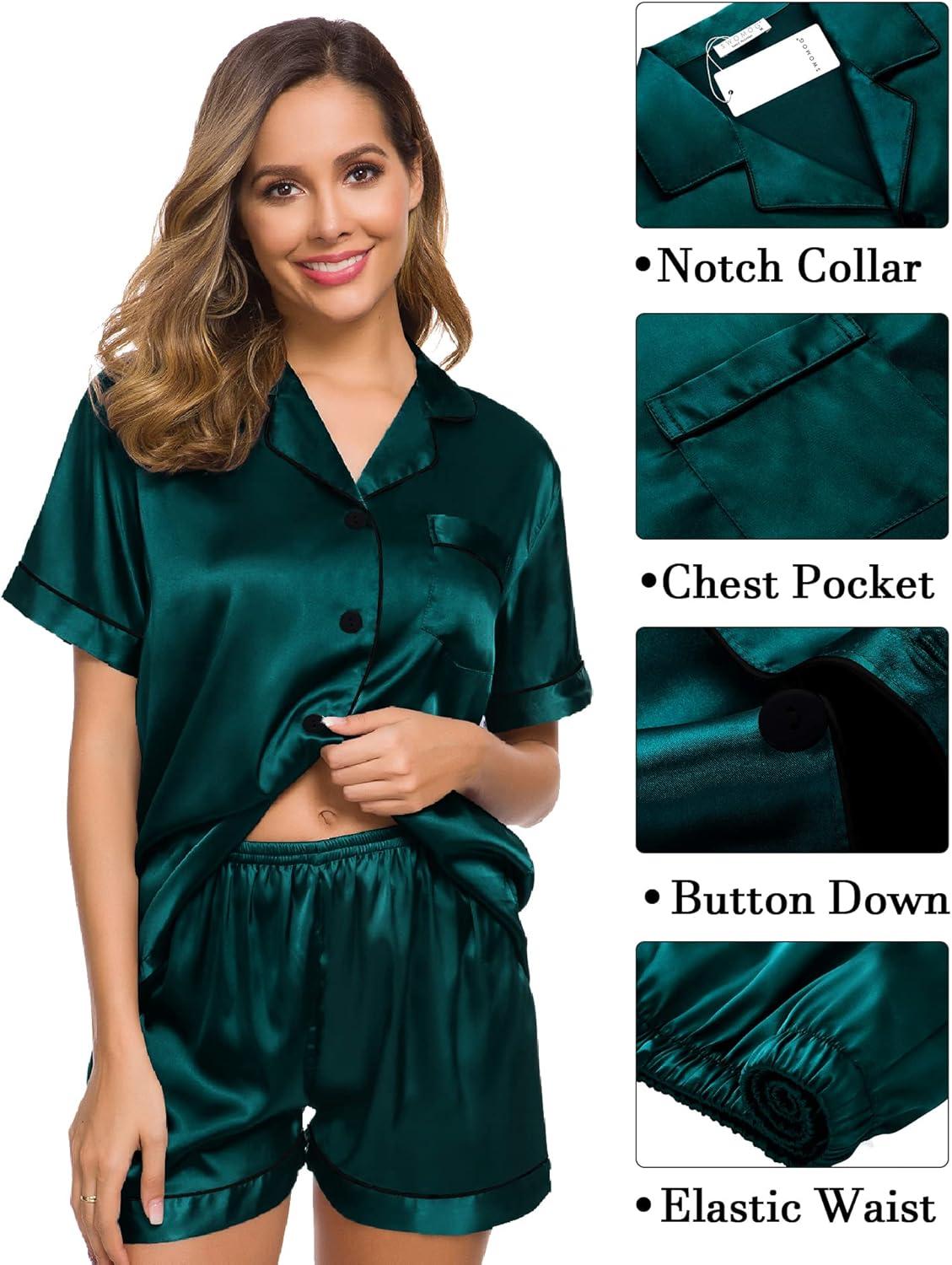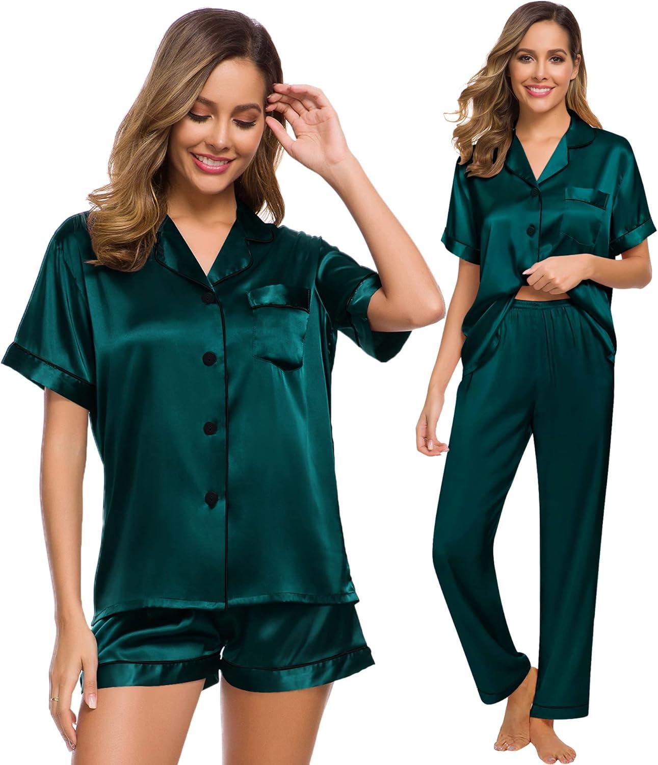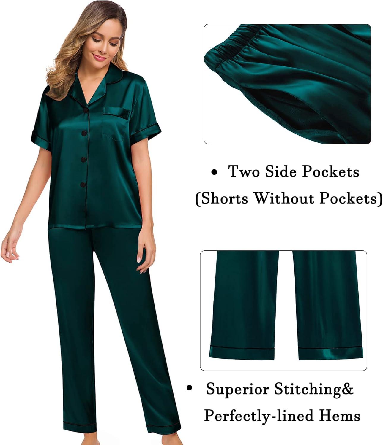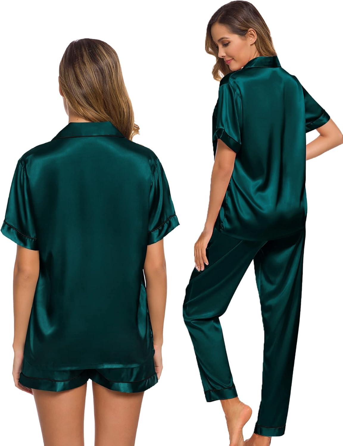 SWOMOG Womens Silk Satin Pajama Sets 3Pcs Button Down Pj Set Short Sleeve Sleepwear Loungewear Pjs Nightwear XS-XXL(Deep Green)