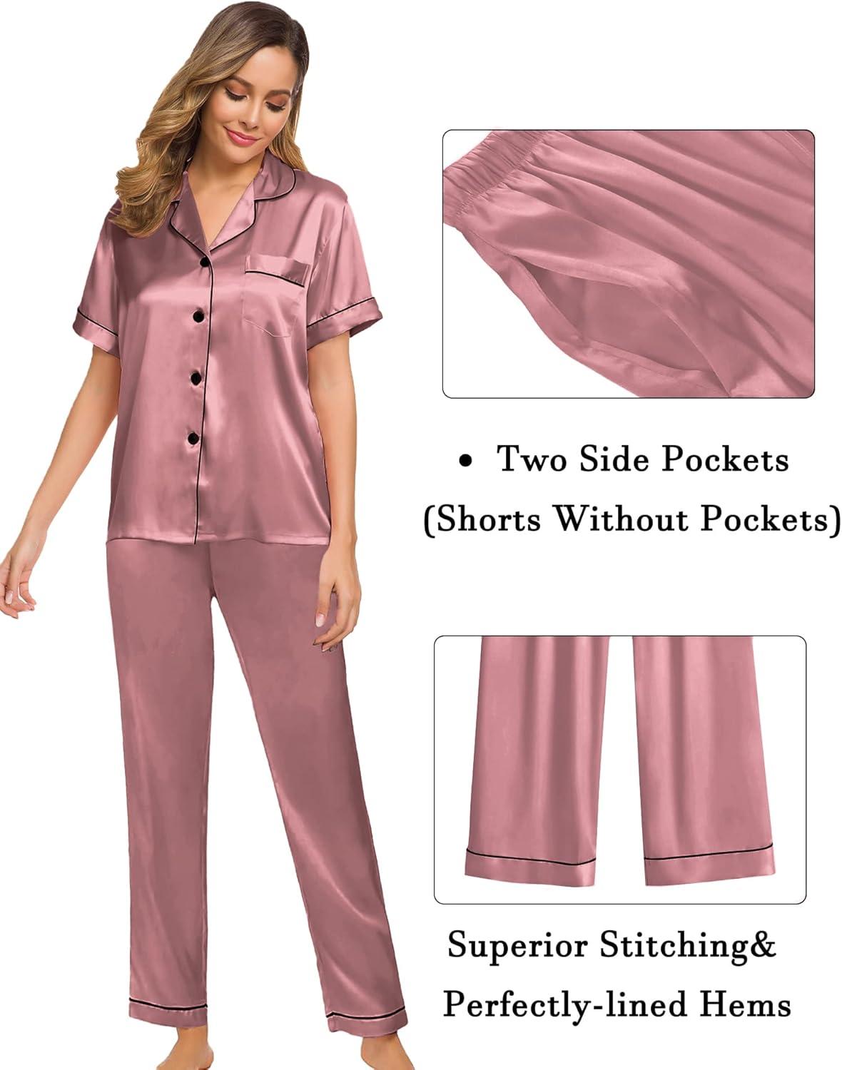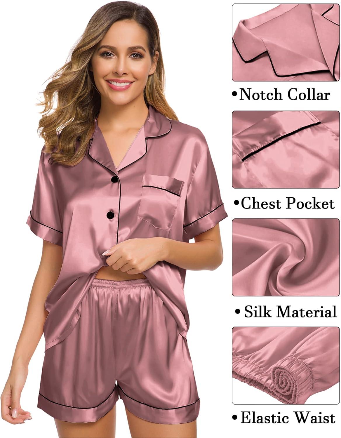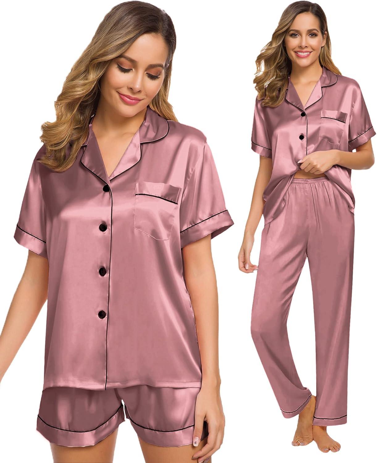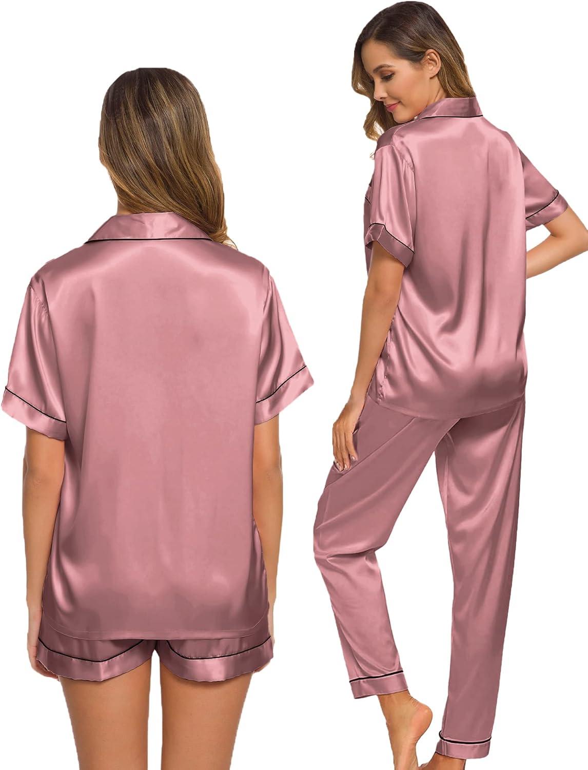 SWOMOG Womens Silk Satin Pajama Sets 3Pcs Button Down Pj Set Short Sleeve Sleepwear Loungewear Pjs Nightwear XS-XXL(Misty Rose)