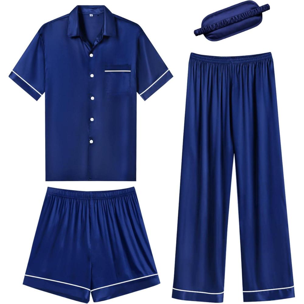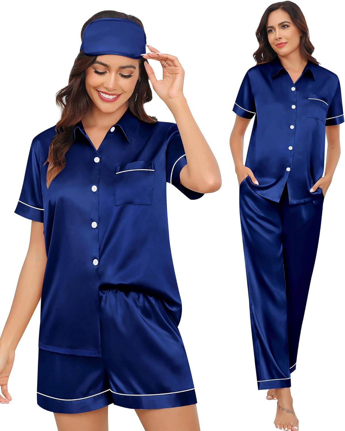 SWOMOG Womens Silk Satin Pajama Sets 3Pcs Button Down Pj Set Short Sleeve Sleepwear Loungewear Pjs Nightwear XS-XXL(Navy Blue With Eye Mask)