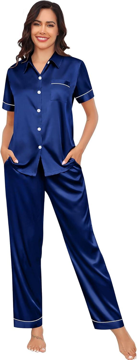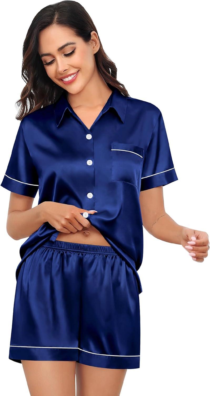 imageSWOMOG Womens Silk Satin Pajama Sets 3Pcs Button Down Pj Set Short Sleeve Sleepwear Loungewear Pjs Nightwear XSXXLNavy Blue With Eye Mask