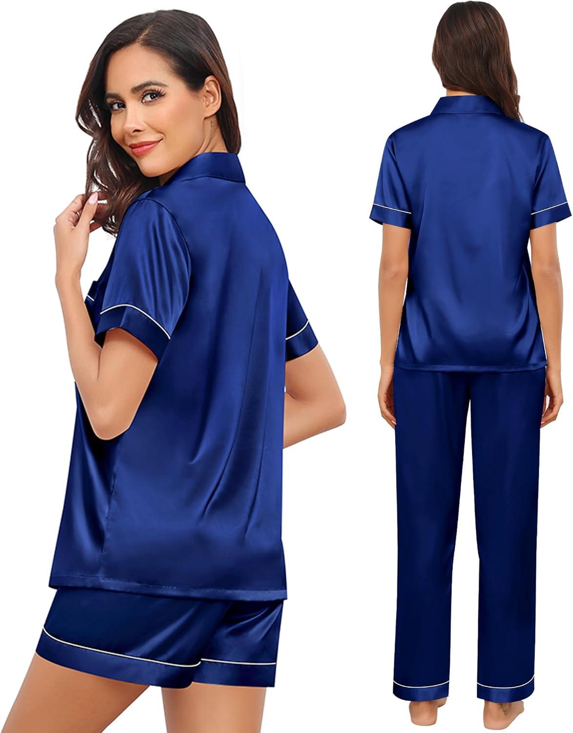 SWOMOG Womens Silk Satin Pajama Sets 3Pcs Button Down Pj Set Short Sleeve Sleepwear Loungewear Pjs Nightwear XS-XXL(Navy Blue)