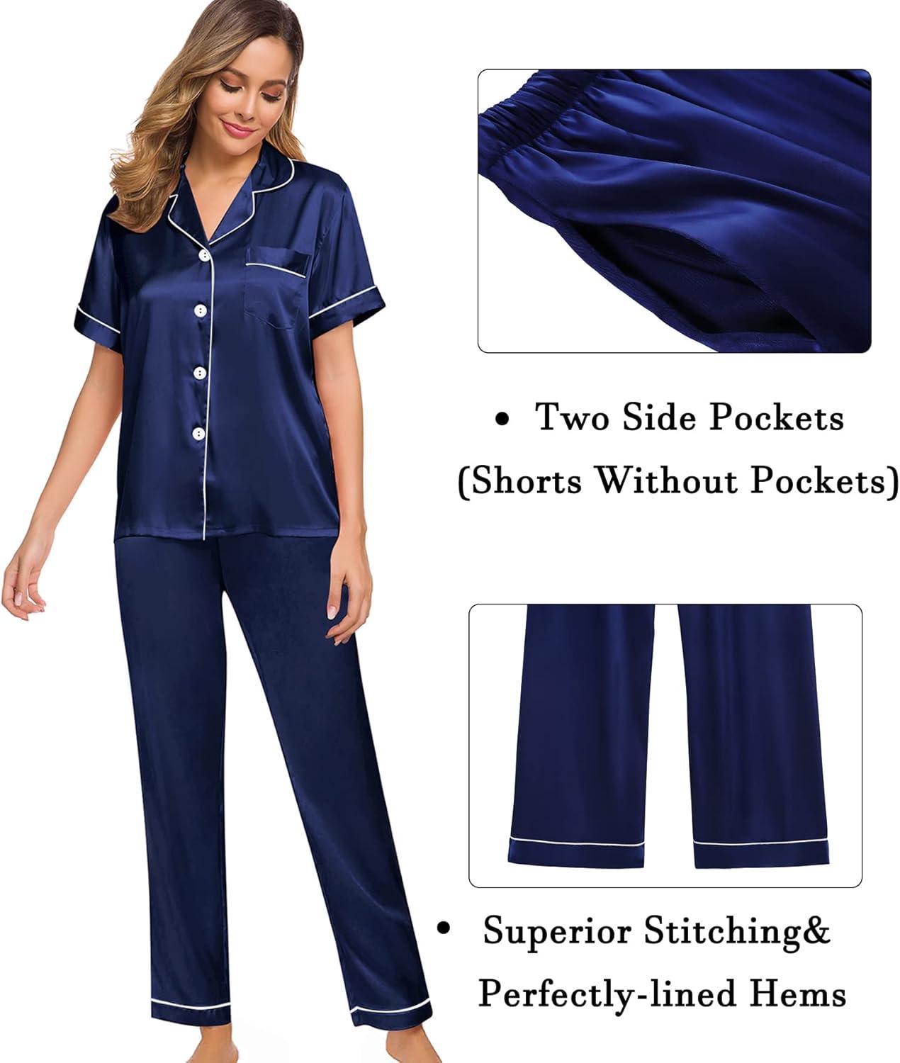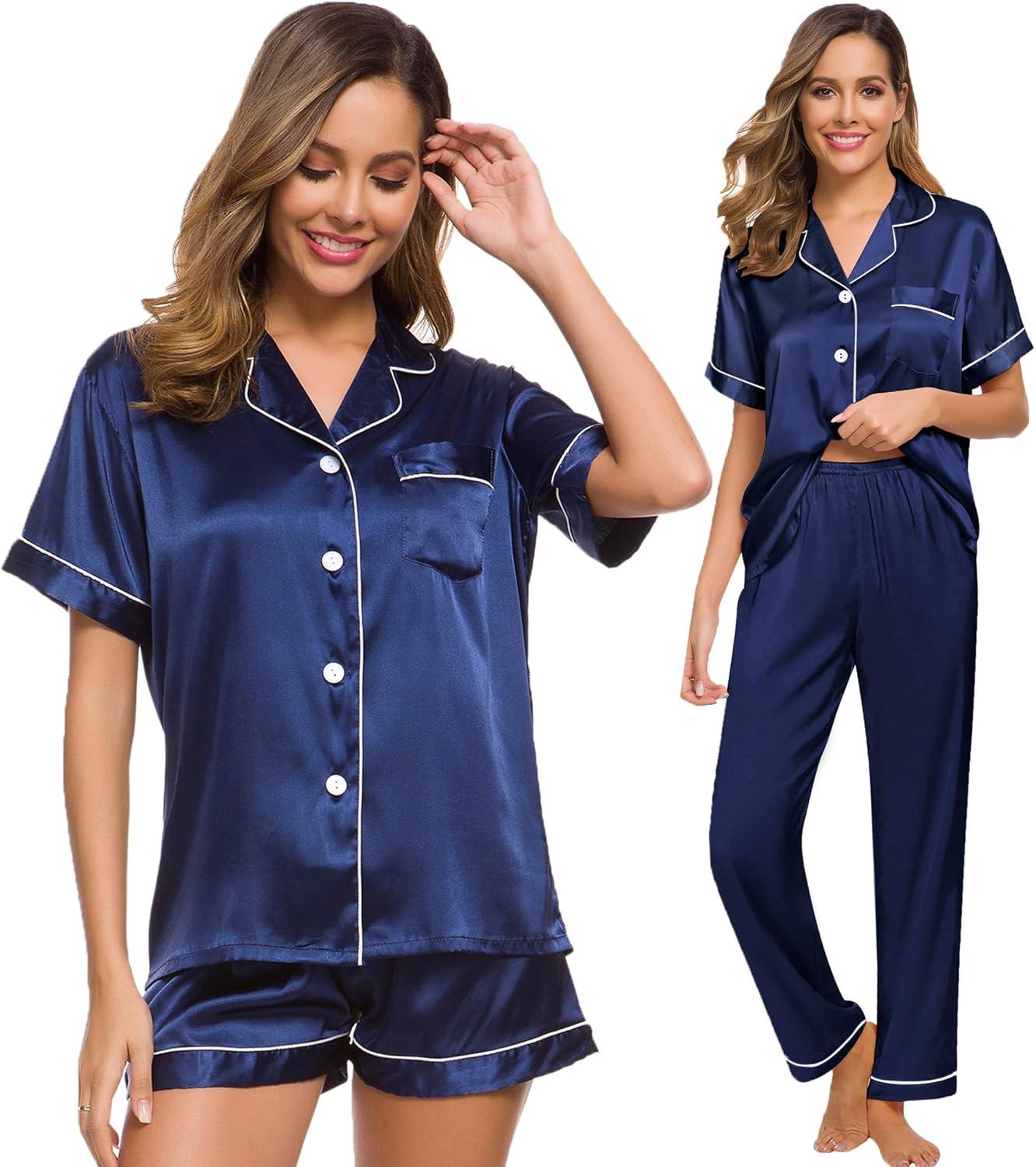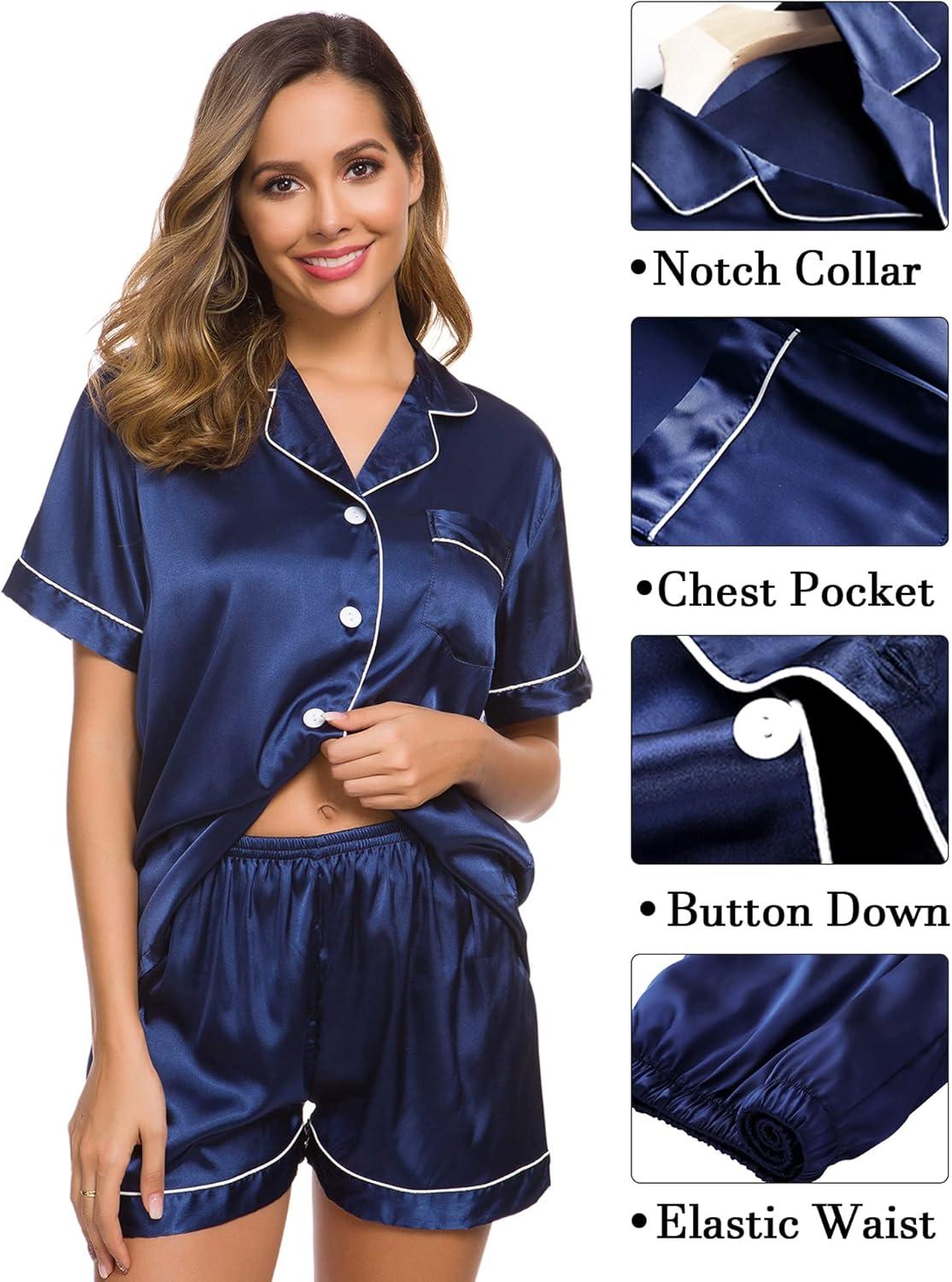 imageSWOMOG Womens Silk Satin Pajama Sets 3Pcs Button Down Pj Set Short Sleeve Sleepwear Loungewear Pjs Nightwear XSXXLNavy Blue With Eye Mask