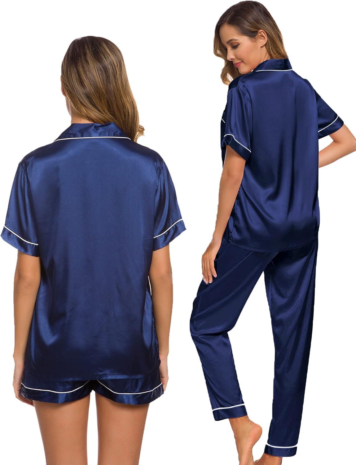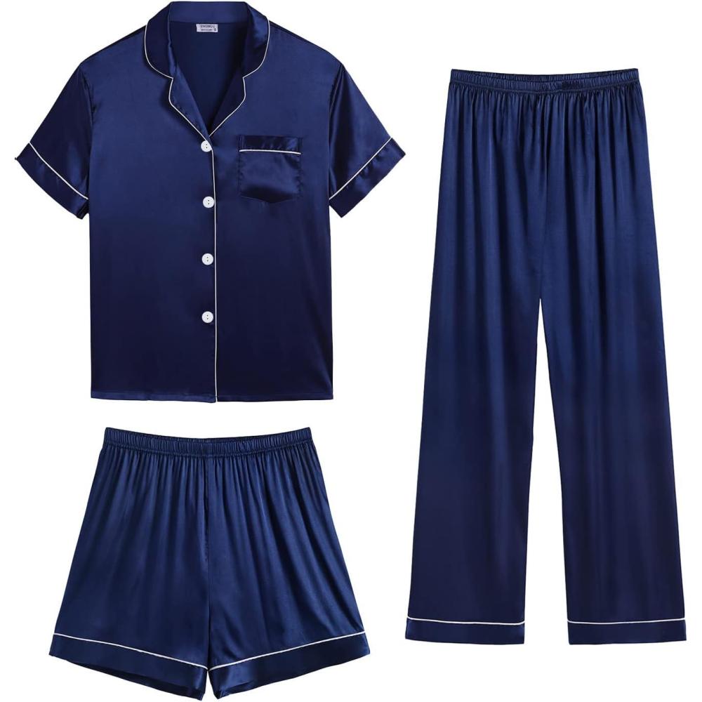 SWOMOG Womens Silk Satin Pajama Sets 3Pcs Button Down Pj Set Short Sleeve Sleepwear Loungewear Pjs Nightwear XS-XXL(Navy Blue)
