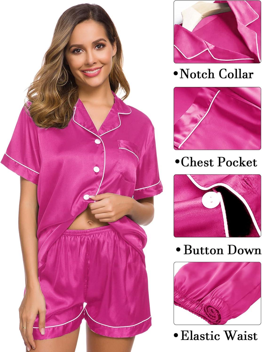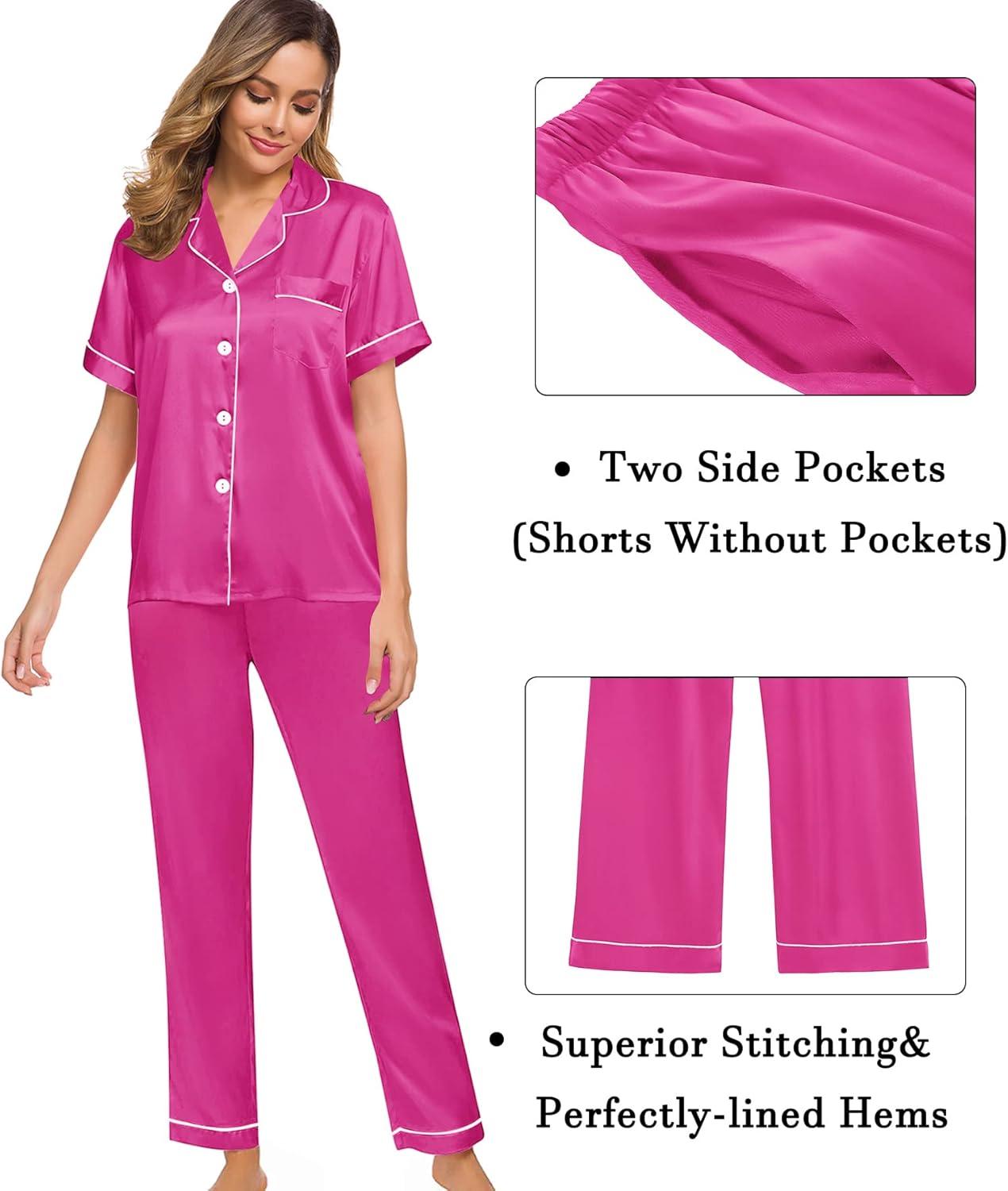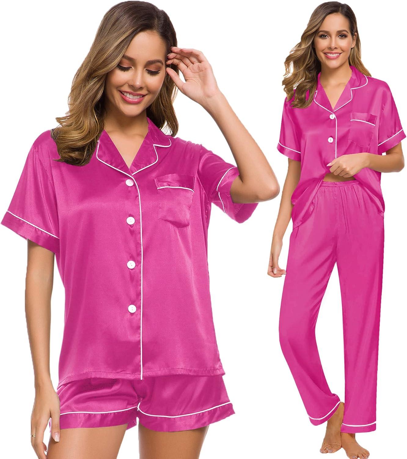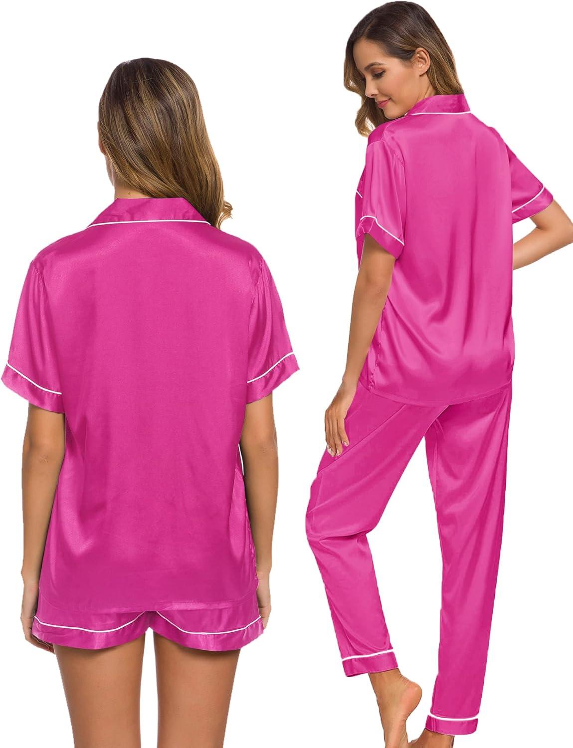 SWOMOG Womens Silk Satin Pajama Sets 3Pcs Button Down Pj Set Short Sleeve Sleepwear Loungewear Pjs Nightwear XS-XXL(Rose Red)