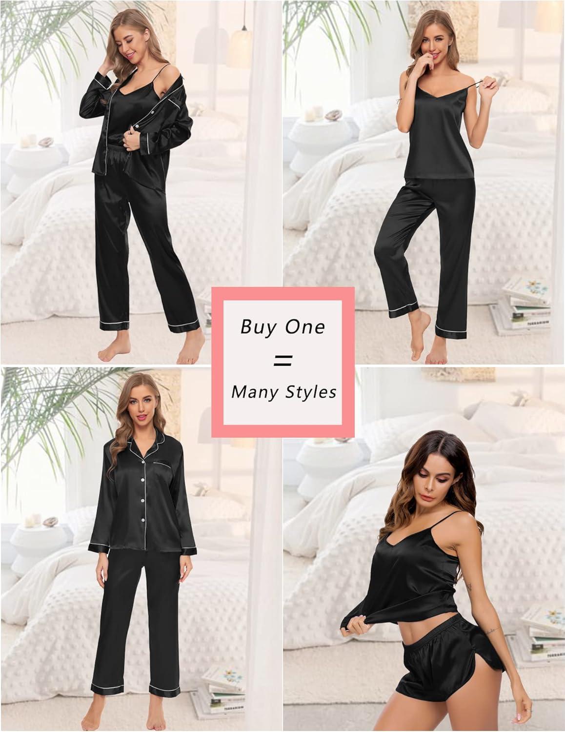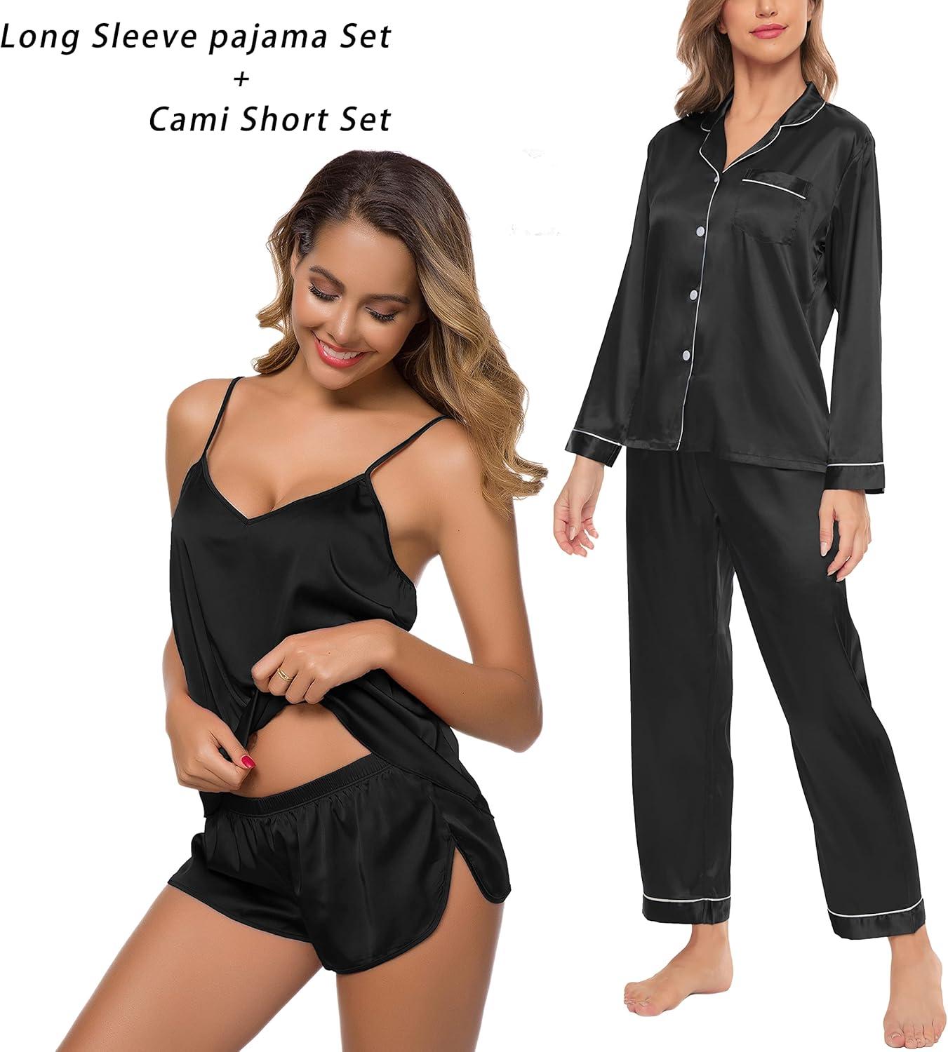 imageSWOMOG Womens Silk Satin Pajamas Sets 4pcs Loungewear Sexy Cami Shorts Set Button Down Long Sleeve Pjs SleepwearLong Sleeve Classicblack