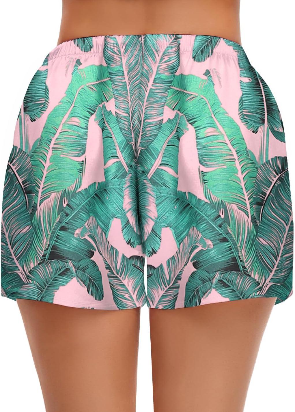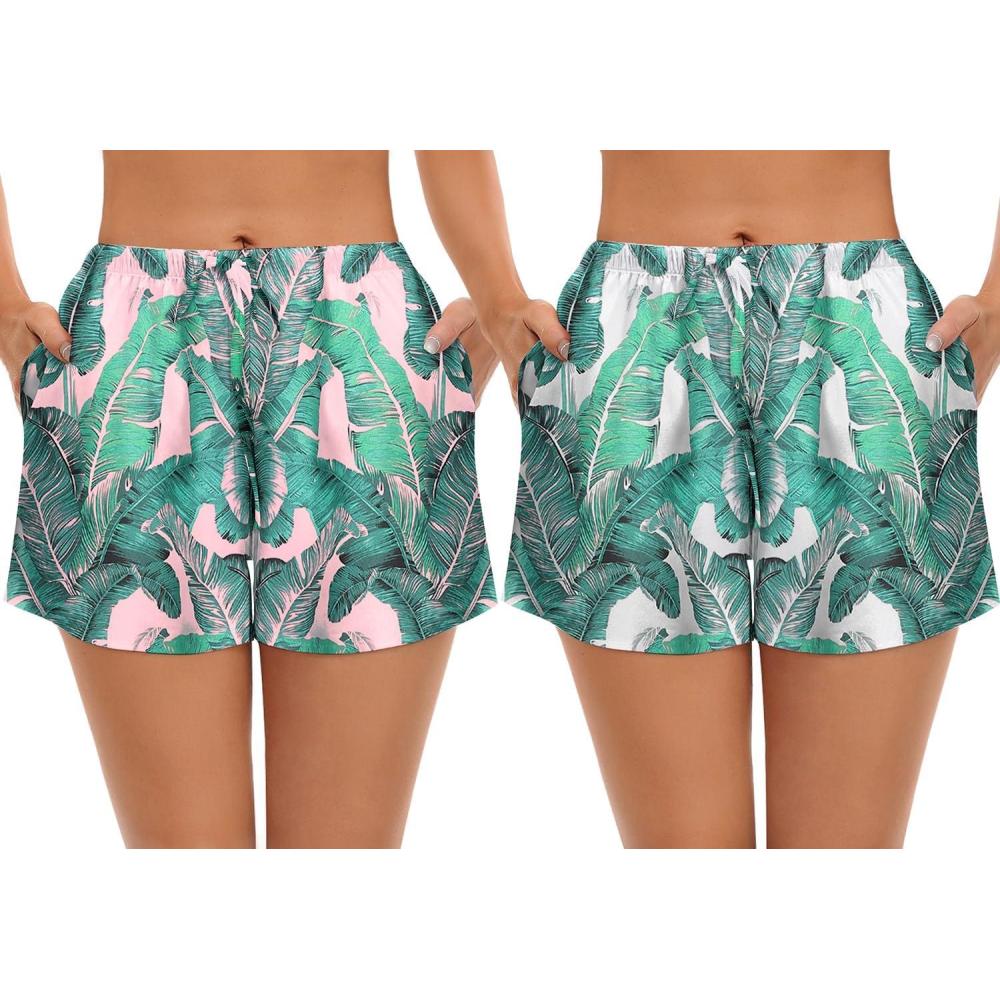 imageSWOMOG Womens Silk Stain Pajama Shorts Pj Bottoms with Pockets Drawstring Sleep Shorts Boxer Soft Lounge ShortsPink LeavesWhite Leaves